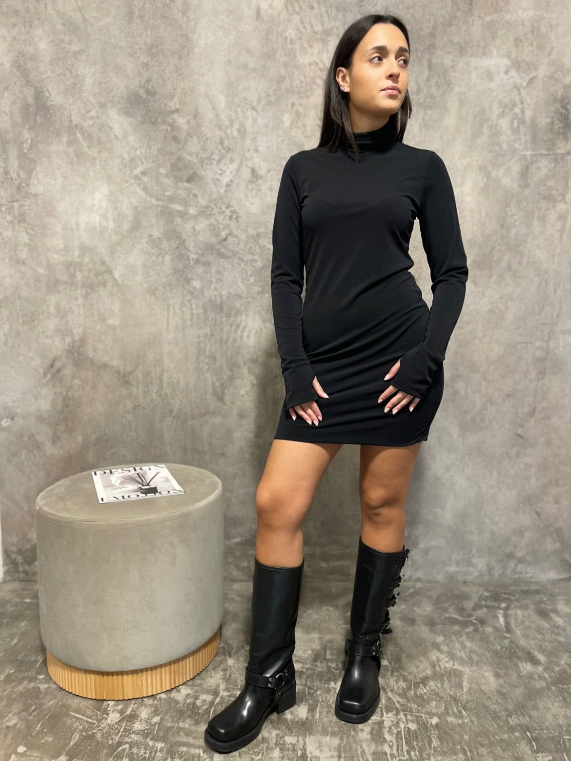 Abito a collo alto in maglina elasticizzato doppio strato.