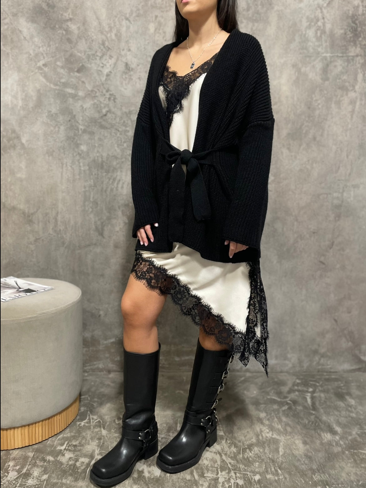 Abito satin colore Panna, con spalline e profili in pizzo nero, spacco laterale.