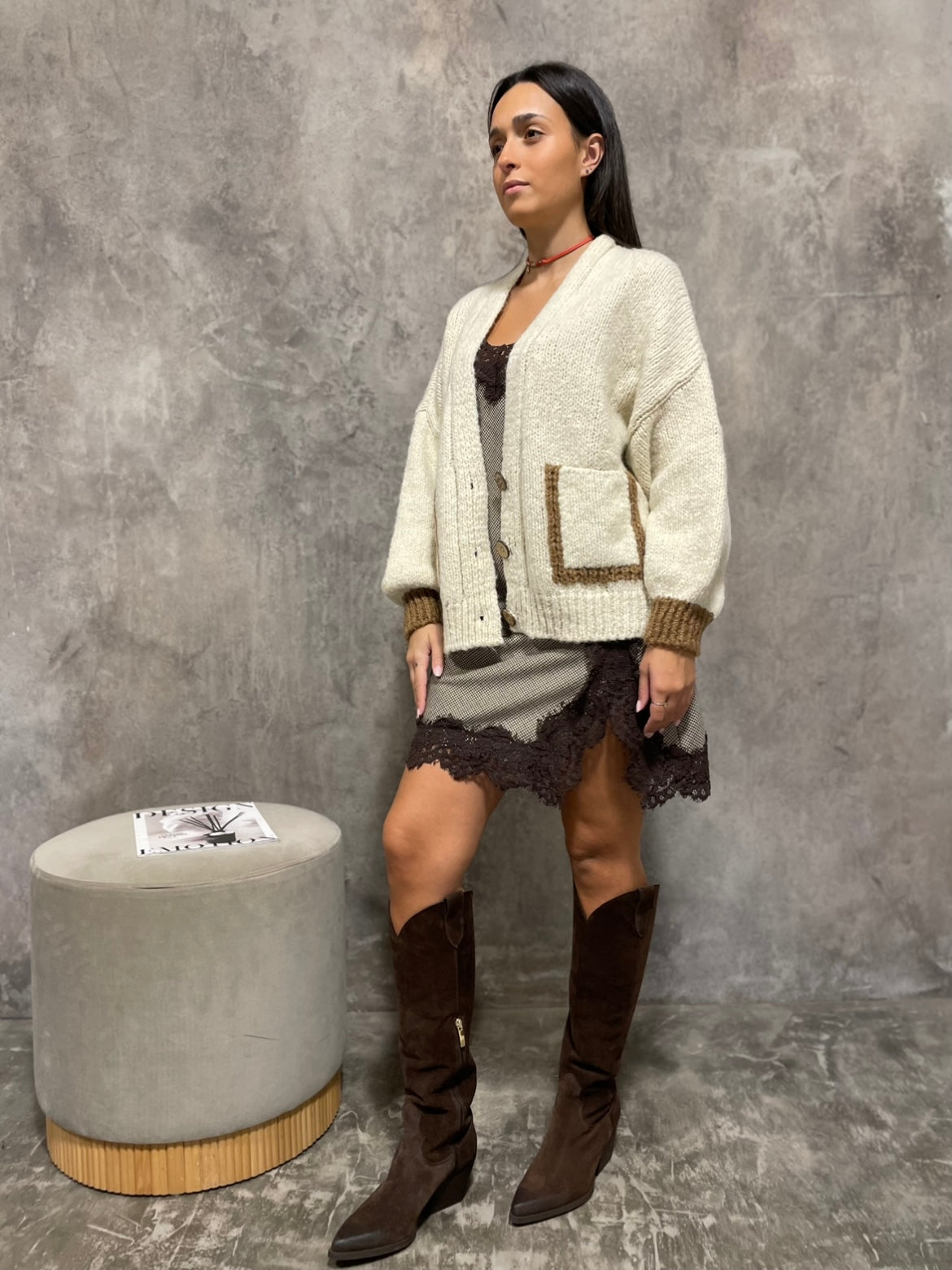 Abito sottoveste fantasia pied de poule con pizzo colore moro e lurex.