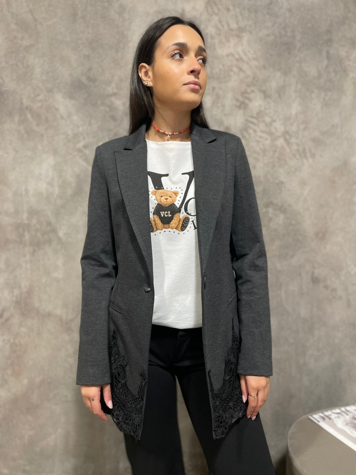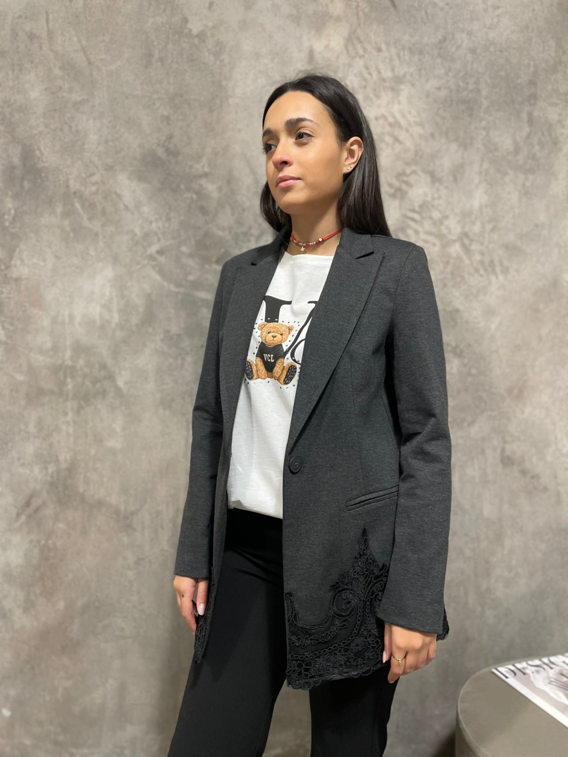 Giacca monopetto con pizzo nero sul fondo, collo con revers, tasche a filetto, chiusura con bottone rivestito.