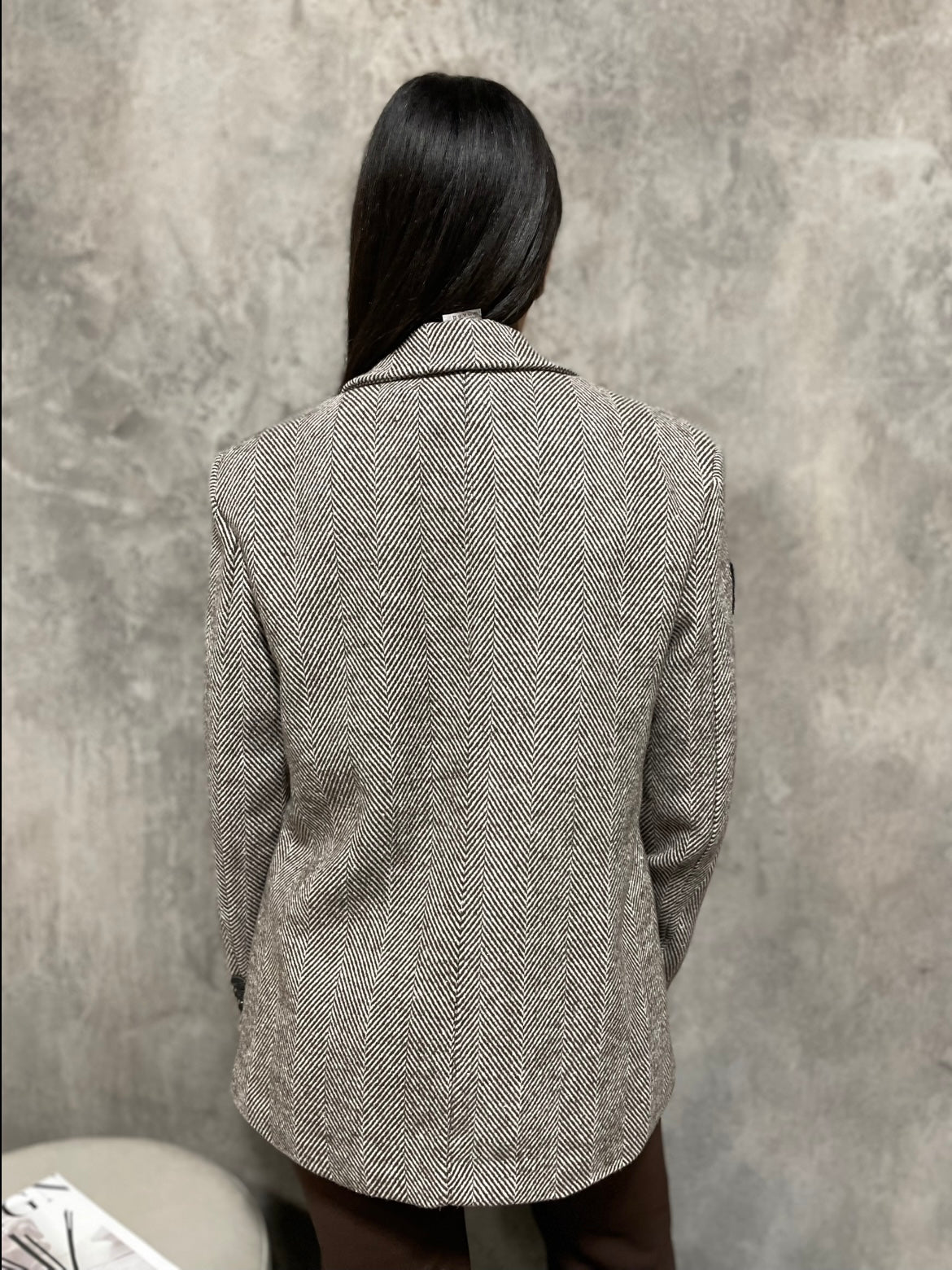 Blazer spigato modello monopetto, con applicazione spille sul reverse.