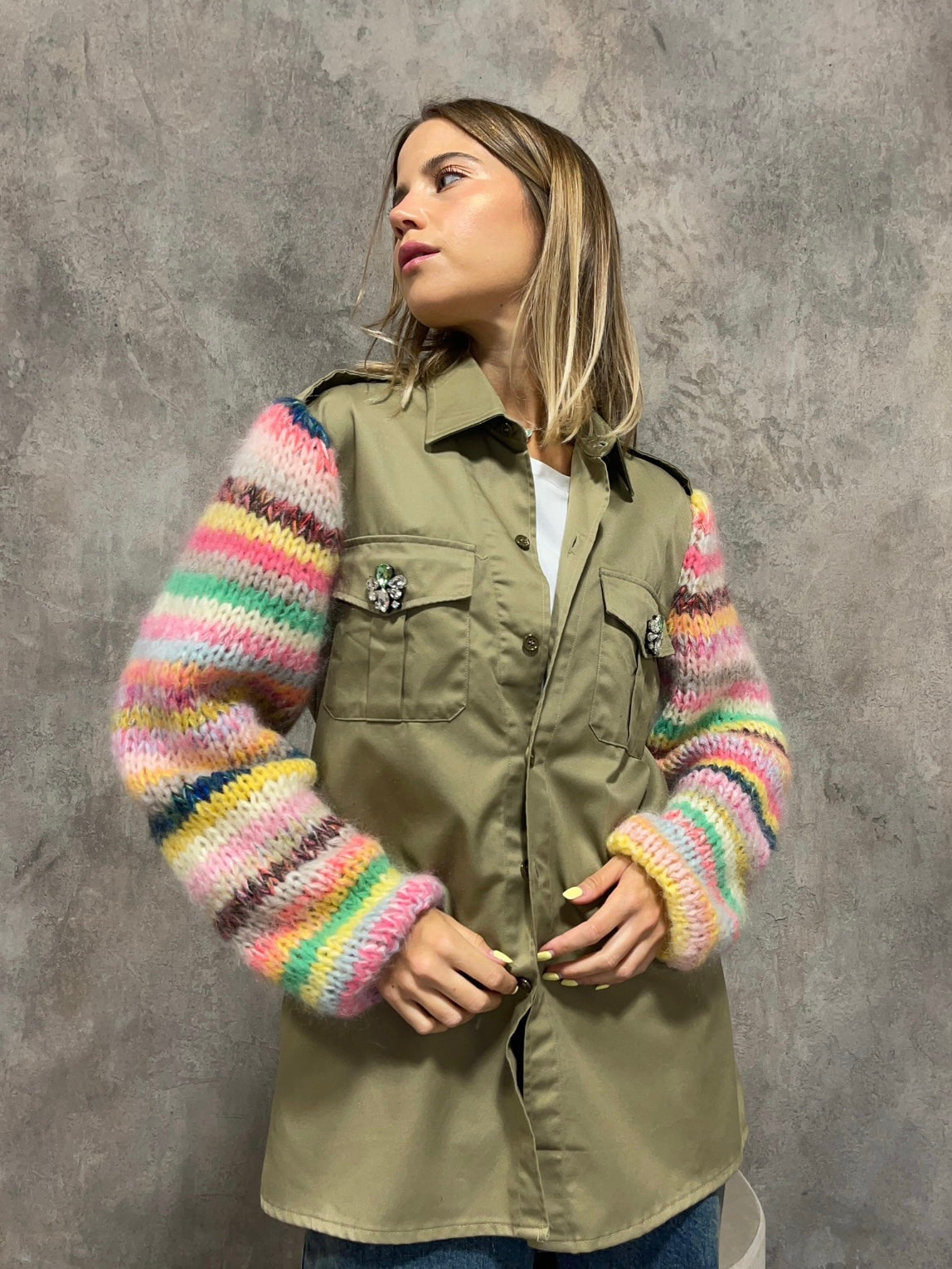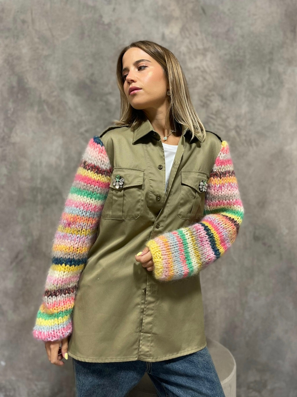 Camicia colore verde con applicazione maniche in maglia fatte a mano in Lana, Alpaca e Mohair.