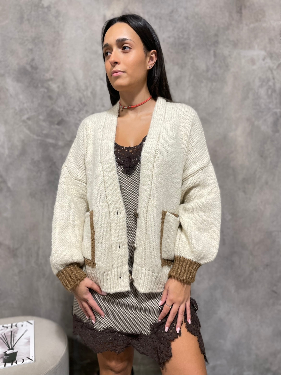 Cardigan con tasche bicolore, chiusura con bottoni.