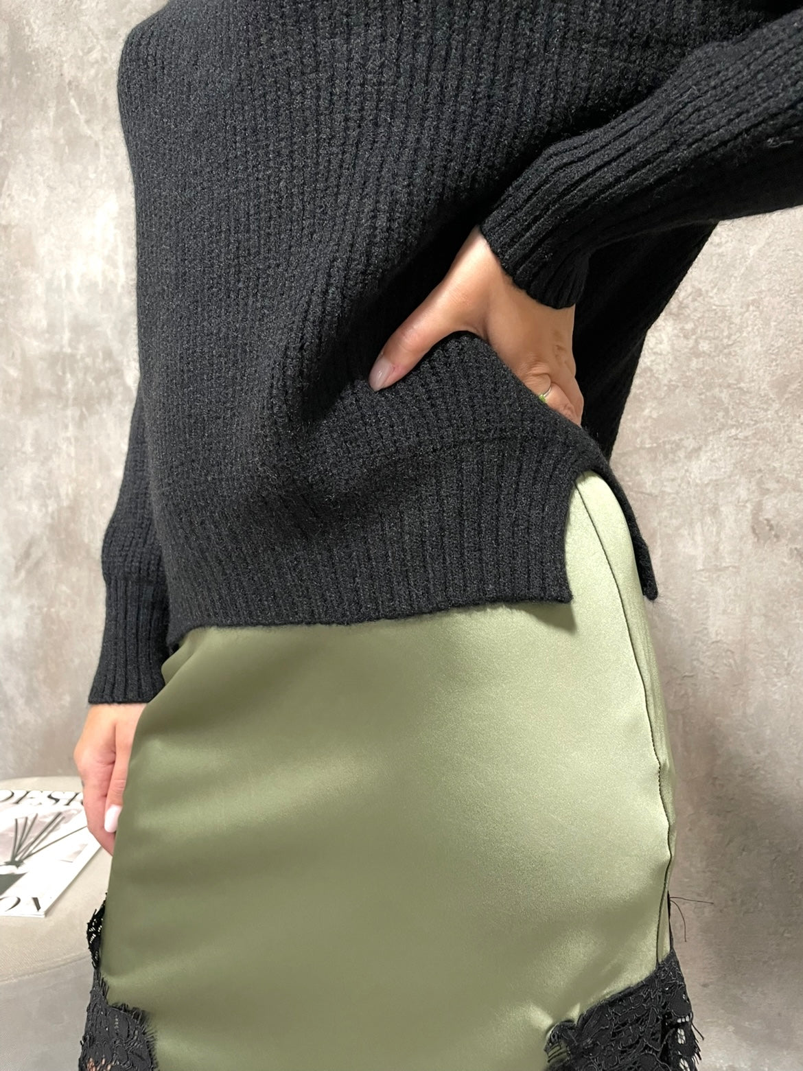 Maglione a coste a collo alto, vestibilità morbida con spacchi laterali.