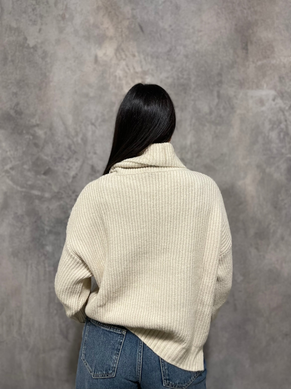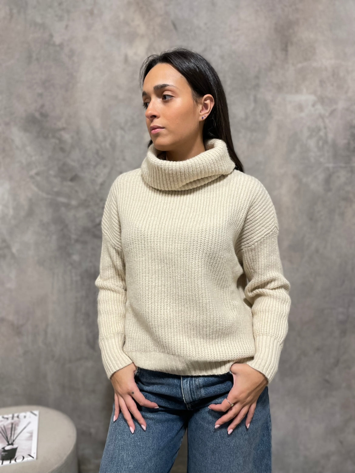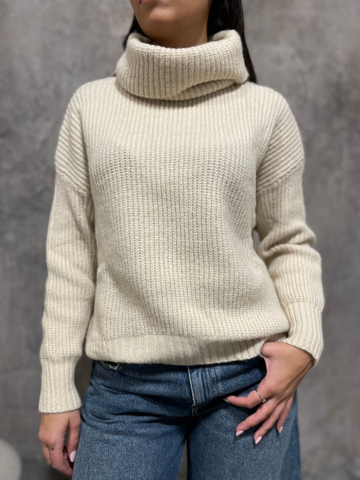 Maglione a coste a collo alto, vestibilità morbida con spacchi laterali.