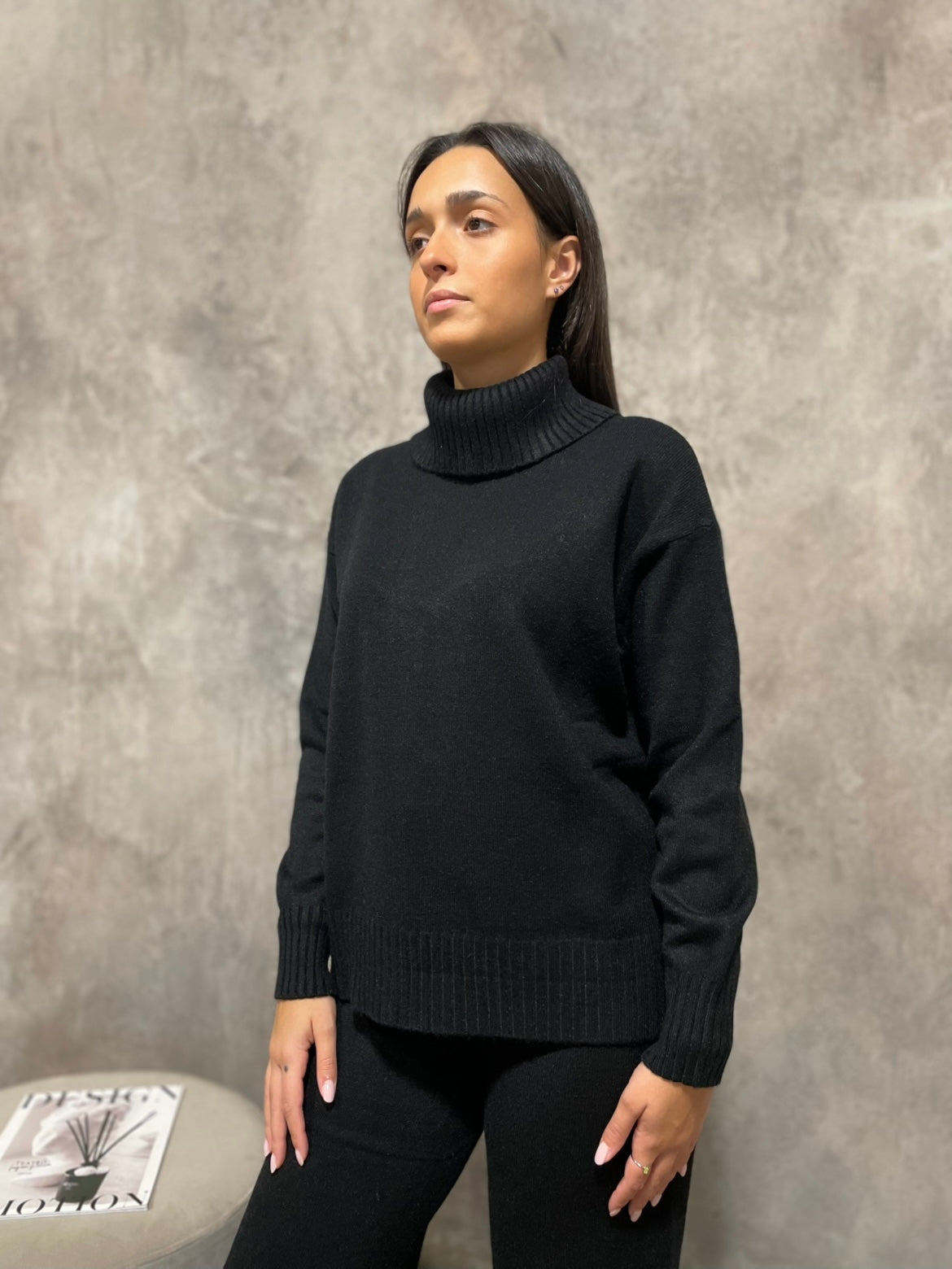 Pantalone morbido con elastico in vita, maglione con collo alto con spacco sul retro.