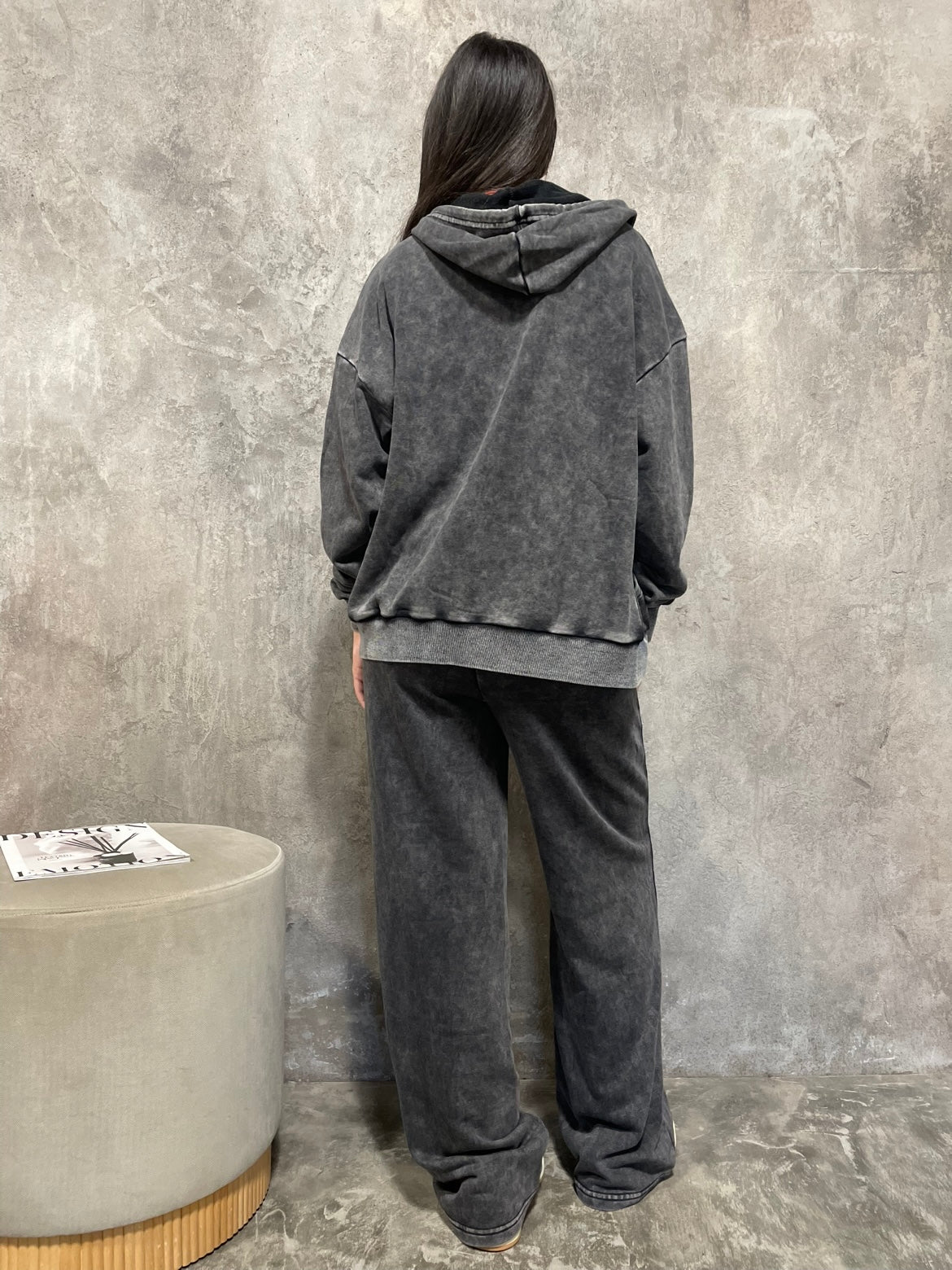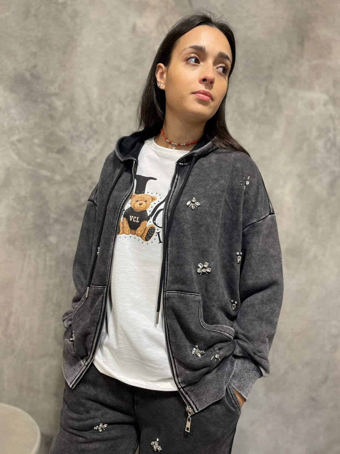 Coordinato felpa più pantalone con strass, felpa con zip e cappuccio, pantalone con elastico in vita a fondo largo.
