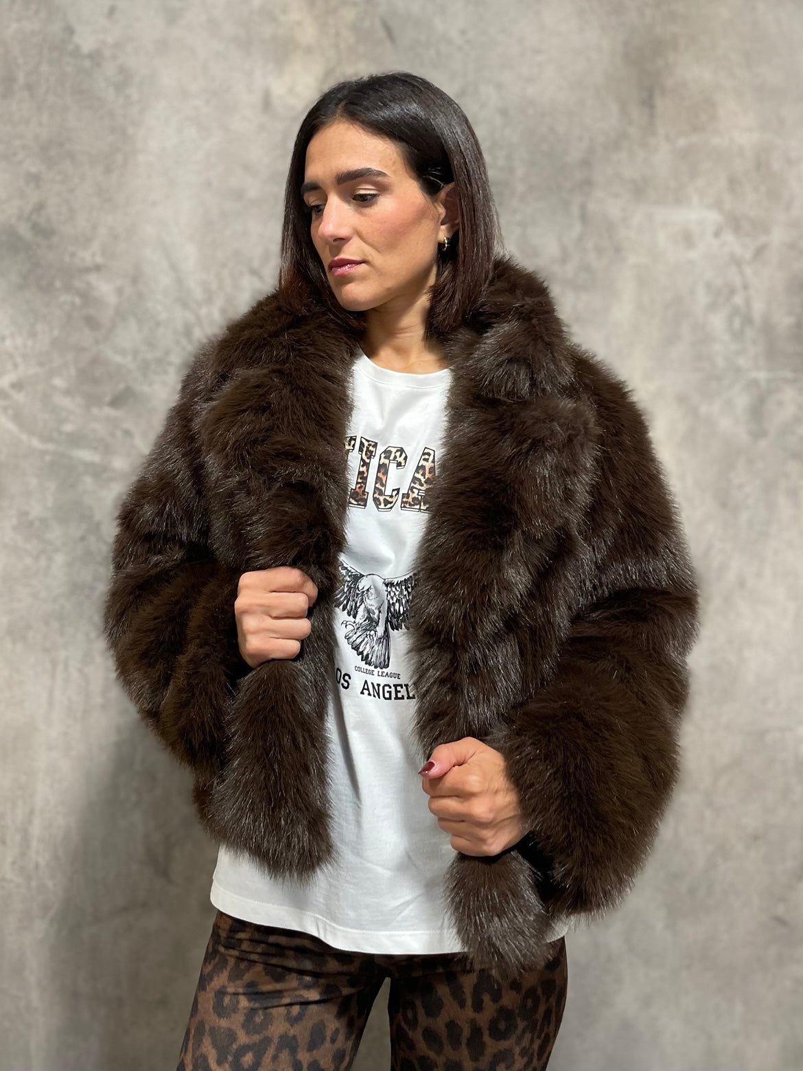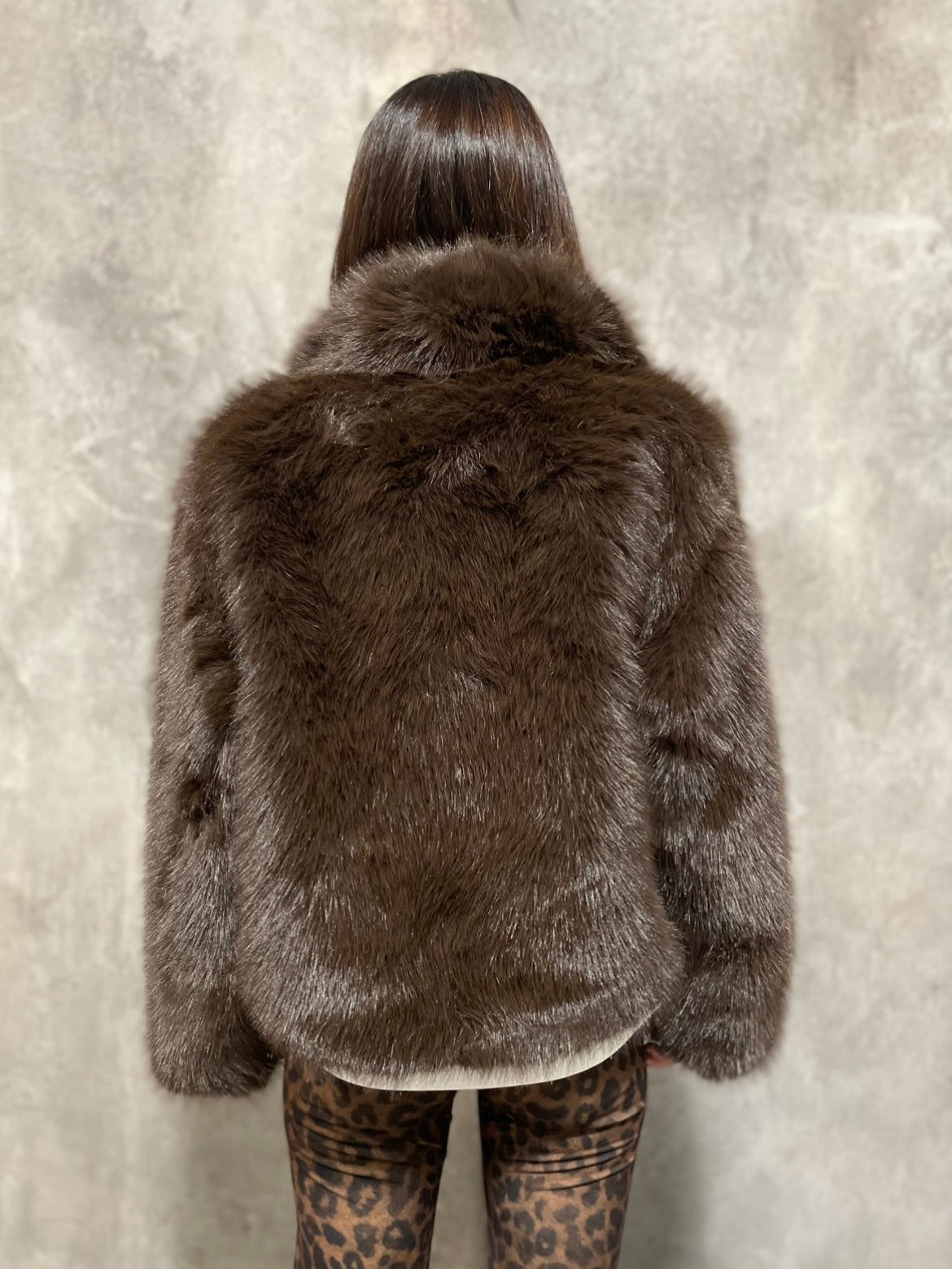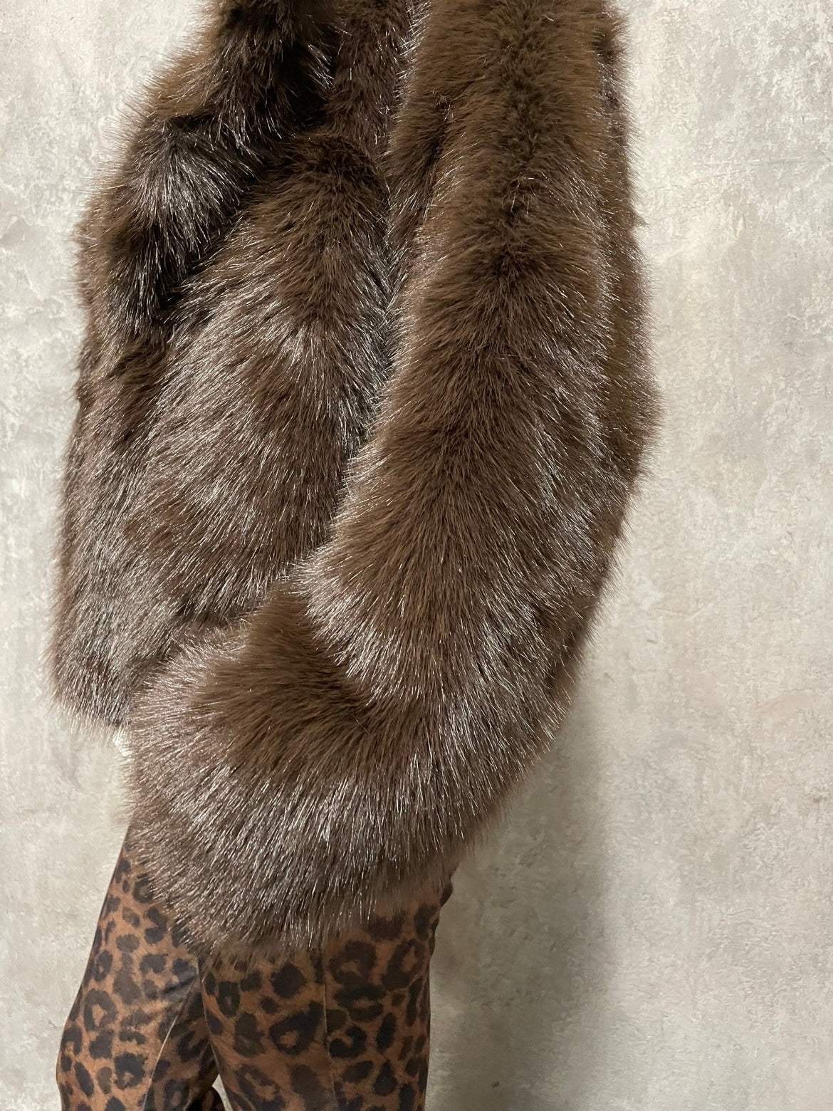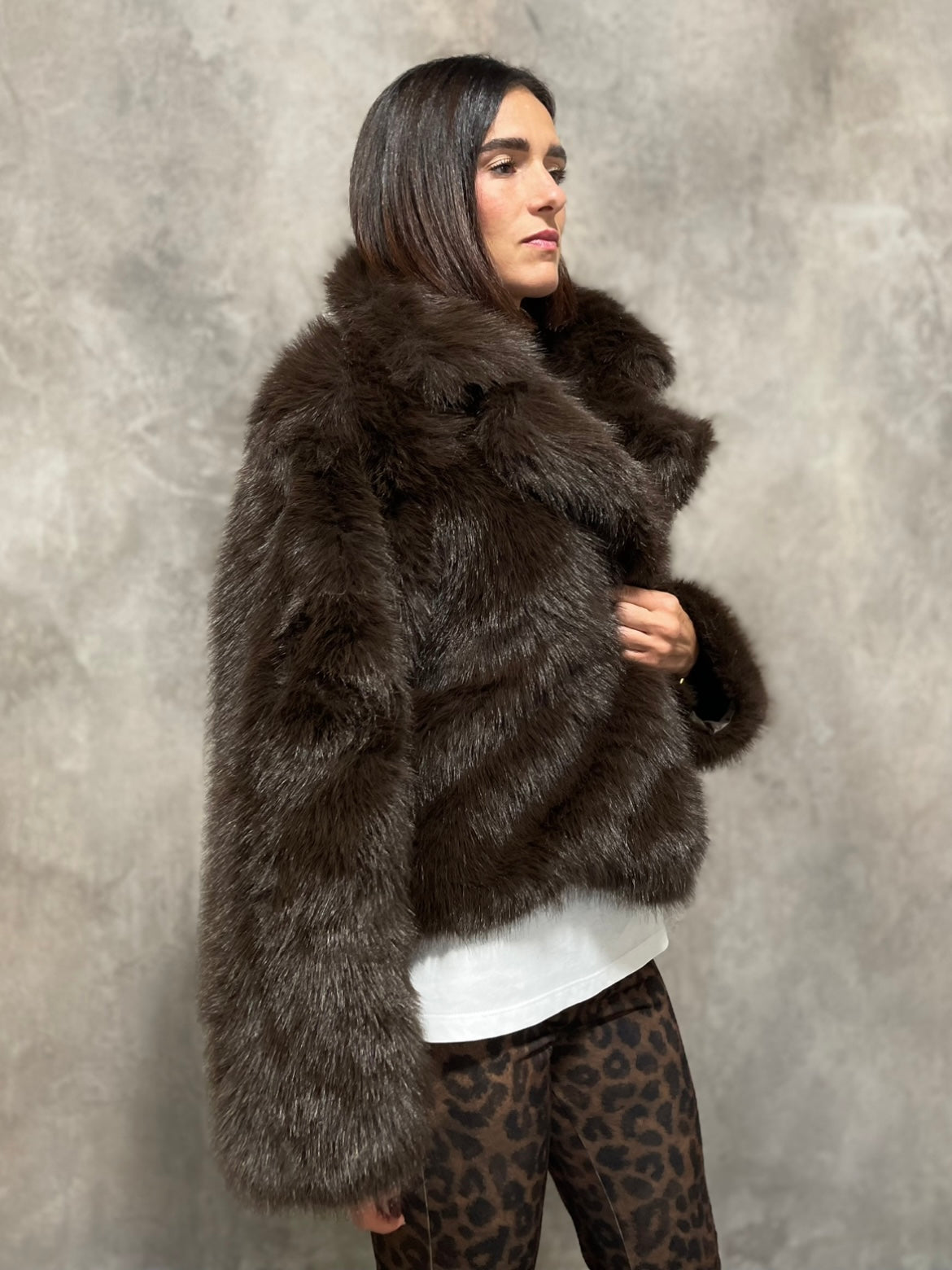 Ecopelliccia colore moro, chiusura con bottone, tasche laterali.