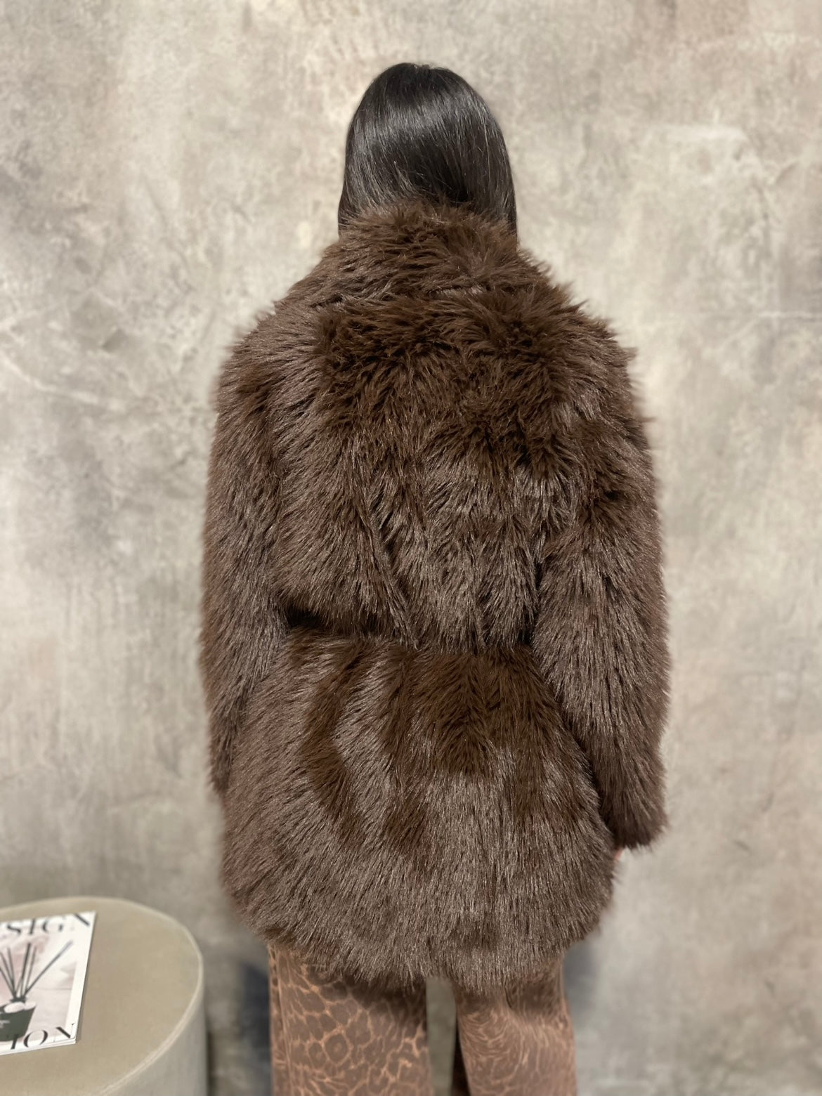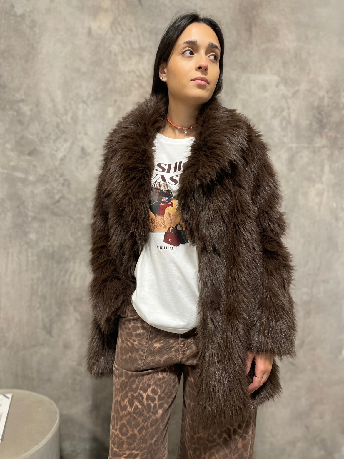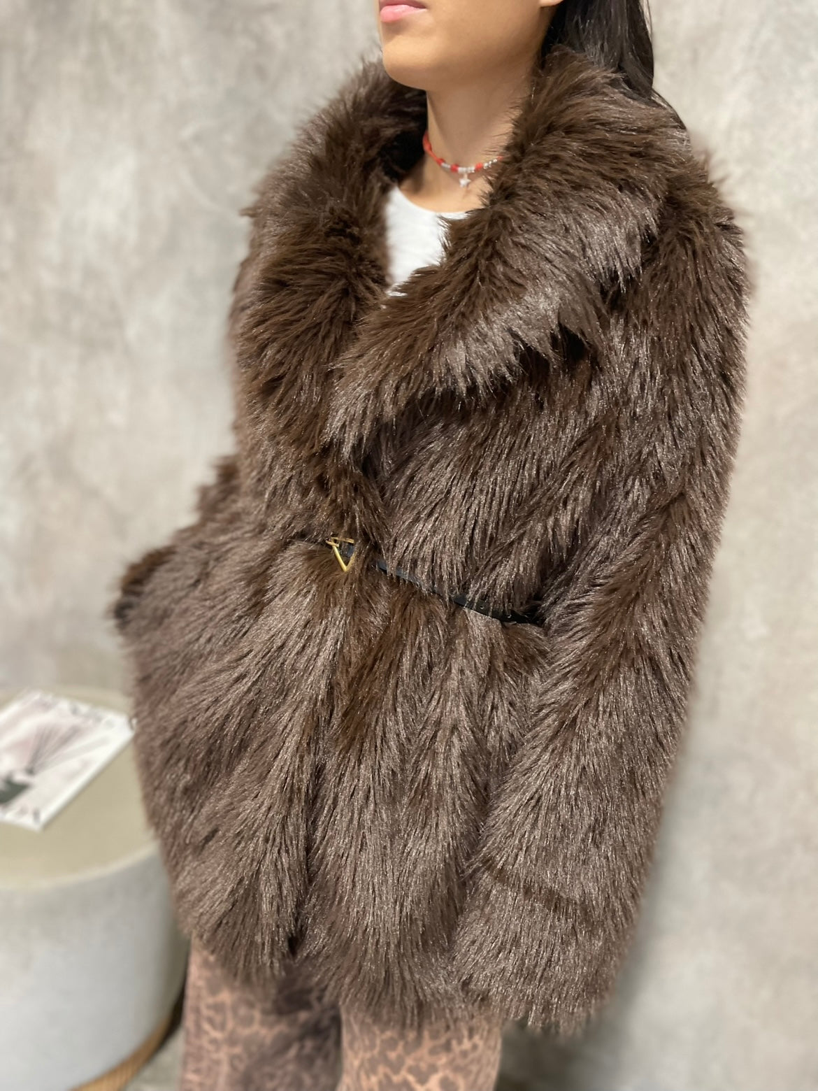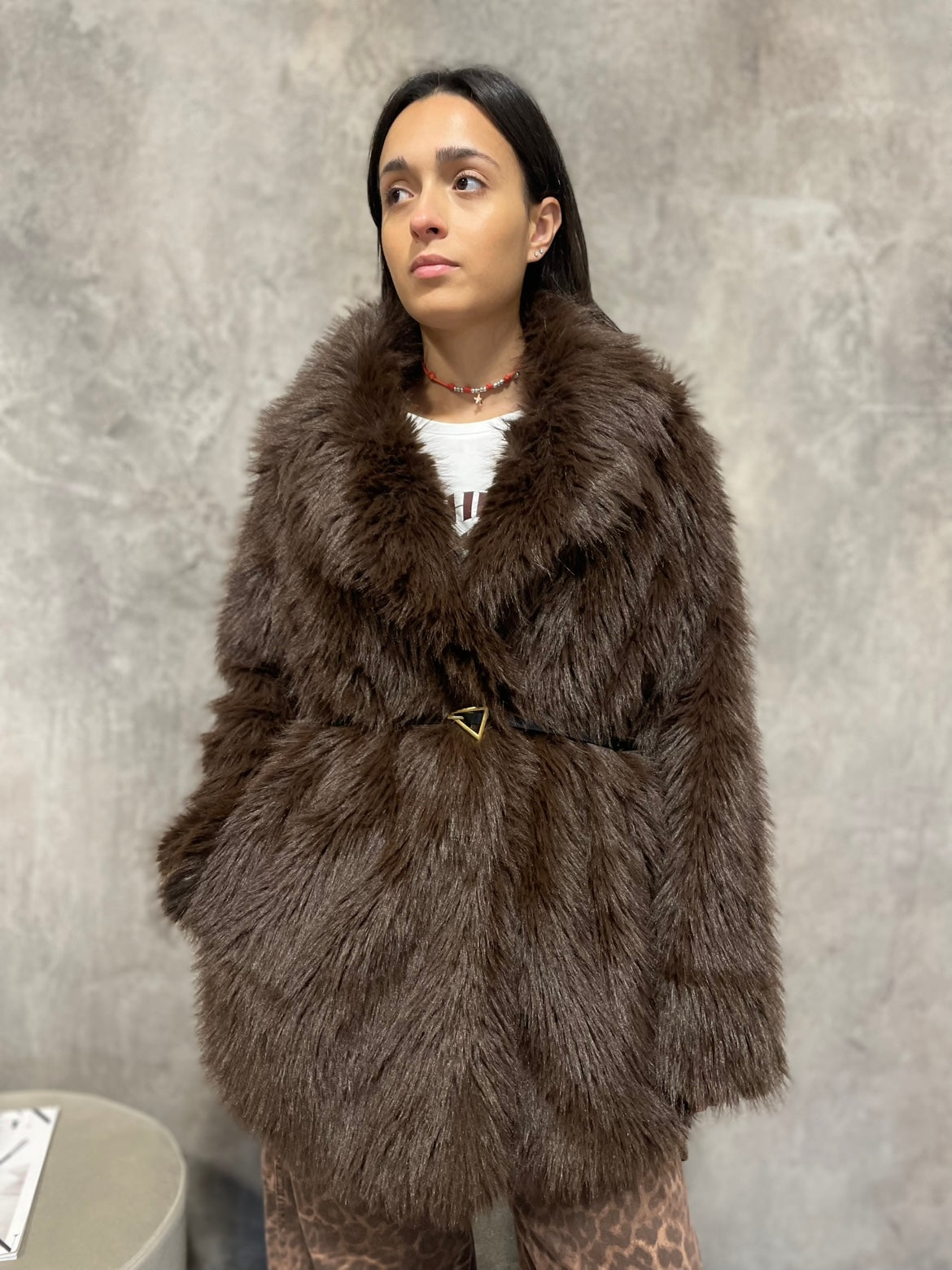 Ecopelliccia colore moro, chiusura con bottoni automatici, cintura NON inclusa.