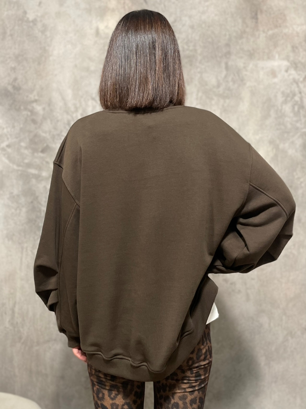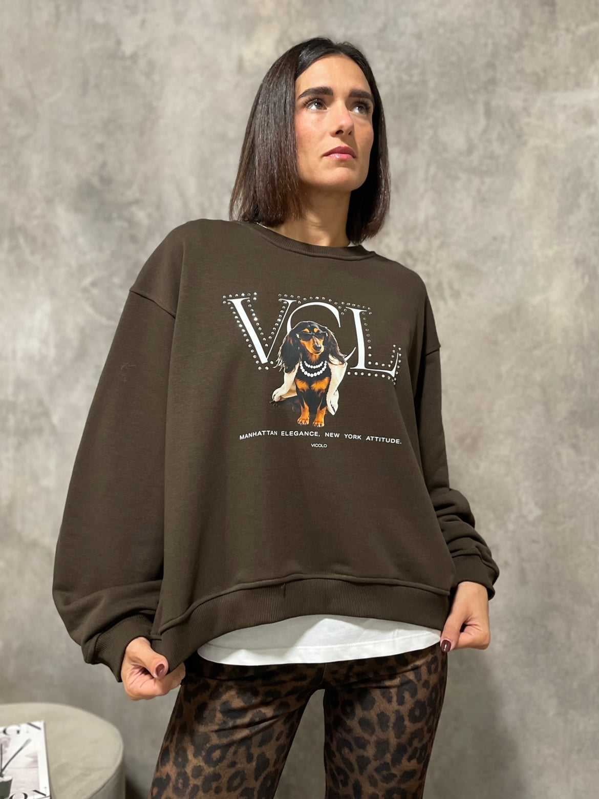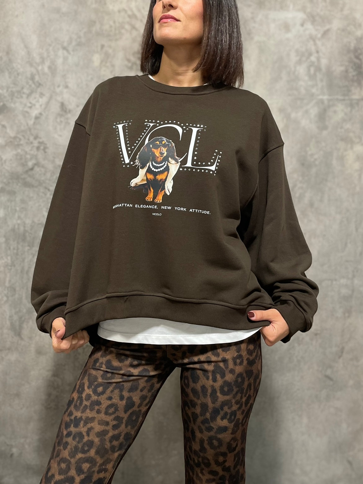 Felpa girocollo modello over più lunga sul retro, stampa frontale con applicazione strass.
