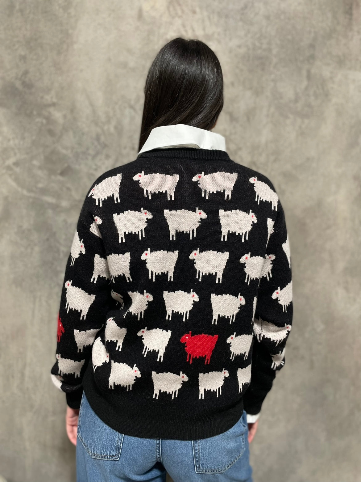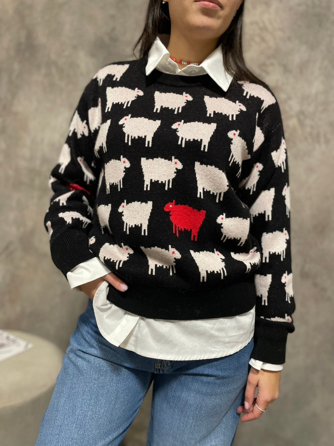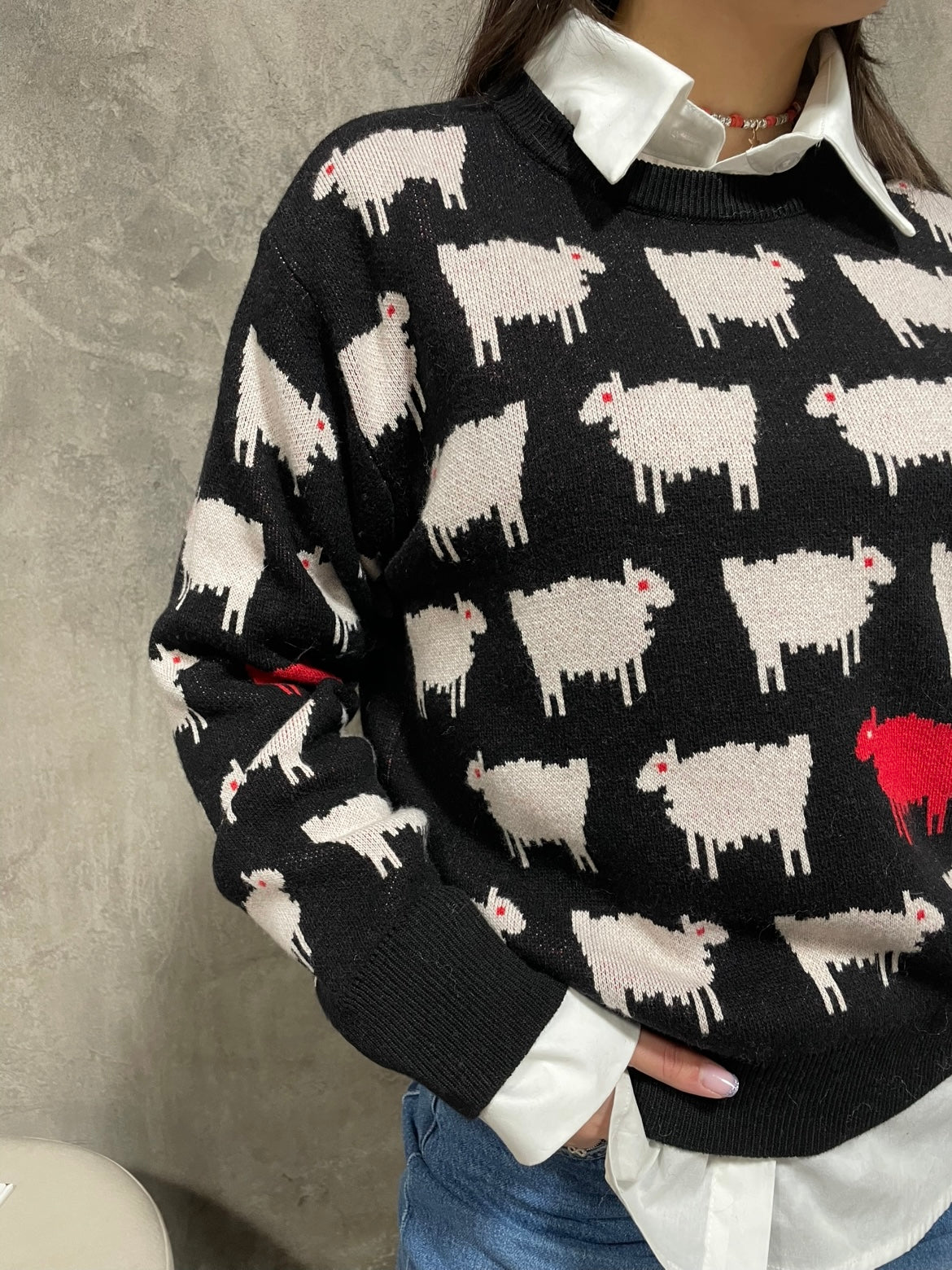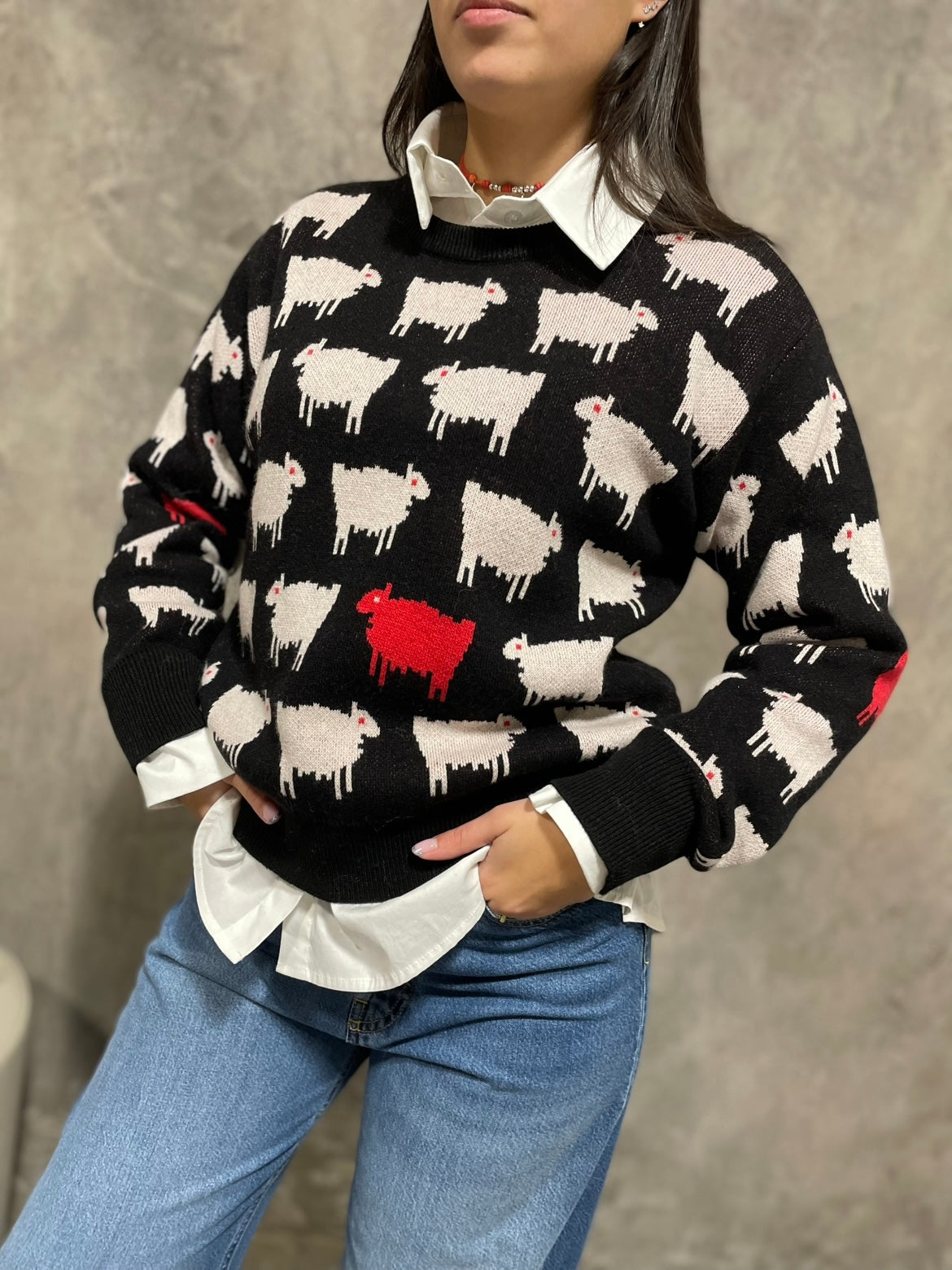 Pullover girocollo maniche lunghe con finiture in maglia a costine. Dettaglio fantasia pecorelle ricamate.