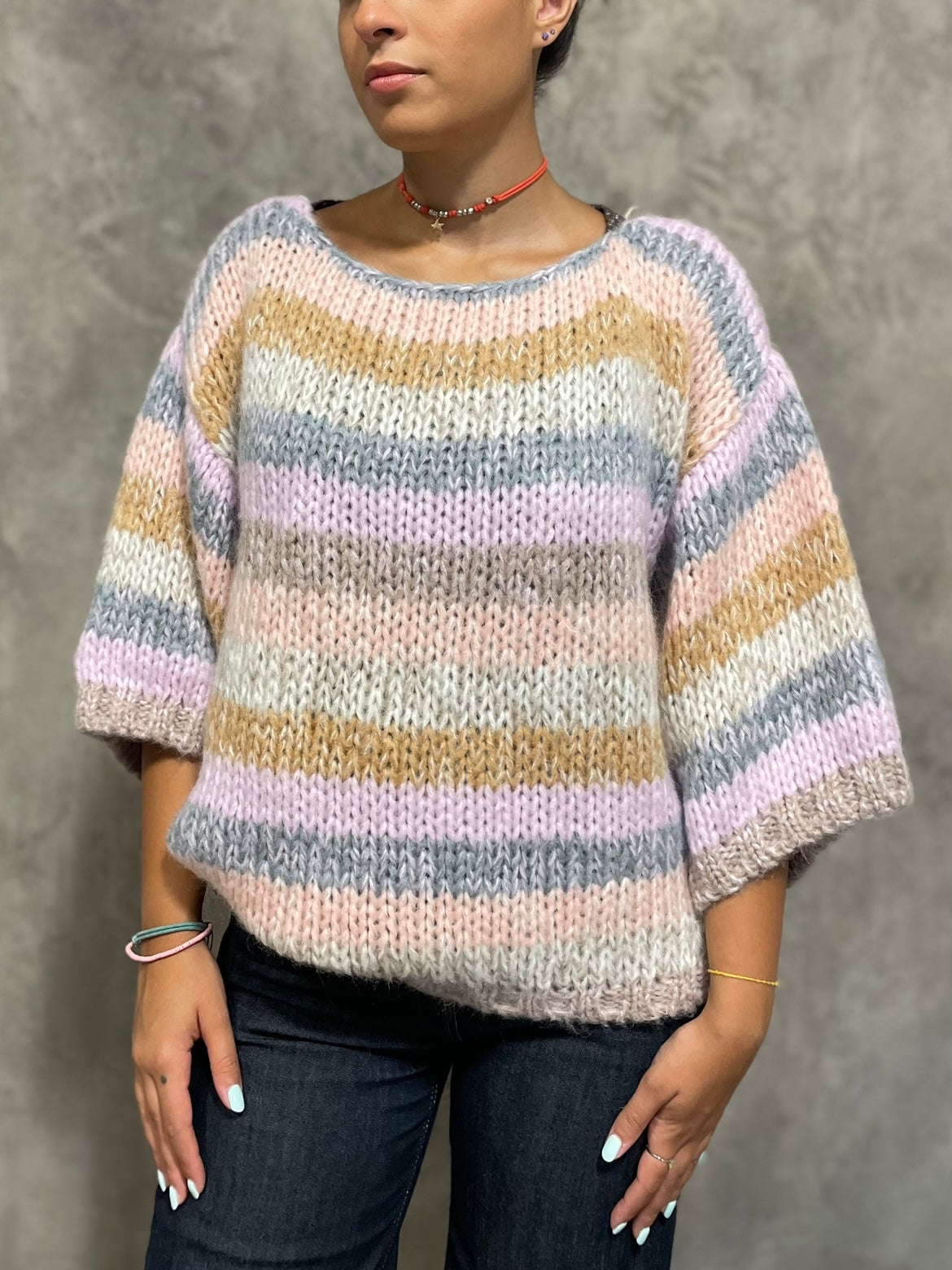 Maglione a righe fatto a mano, manica ampia a 3/4 in Lana, Alpaca e Mohair.