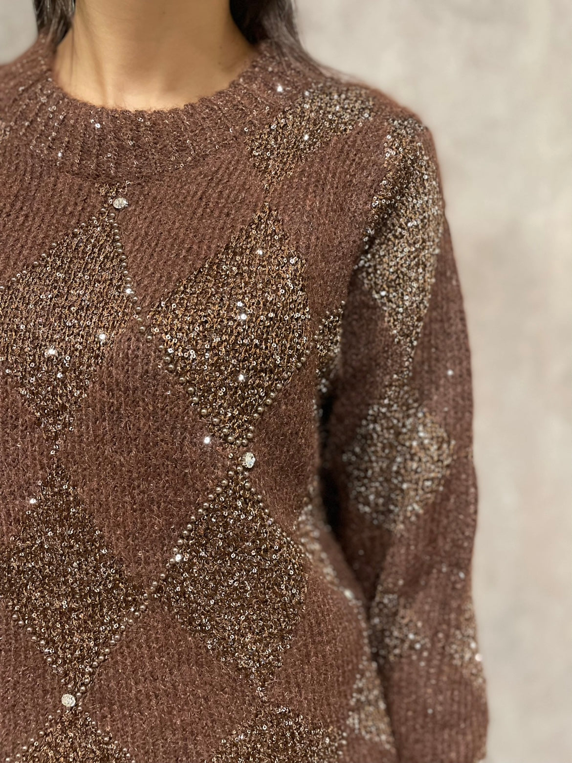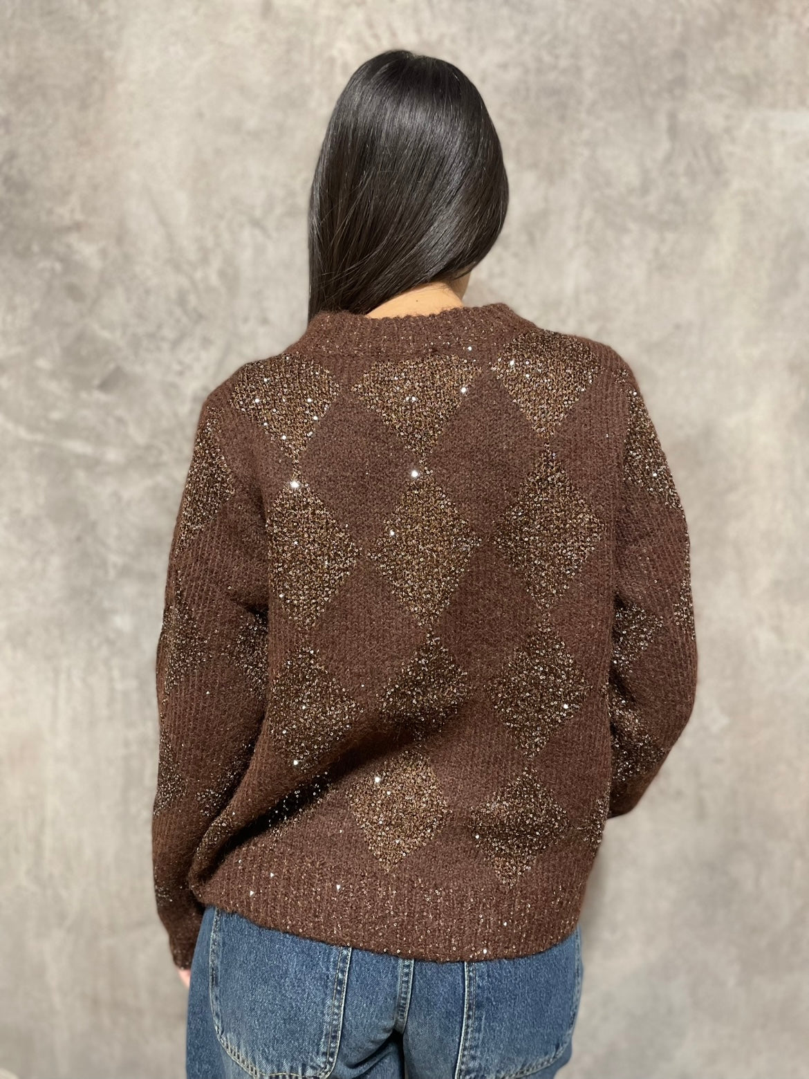Maglia girocollo intarsio lurex con borchie e strass.