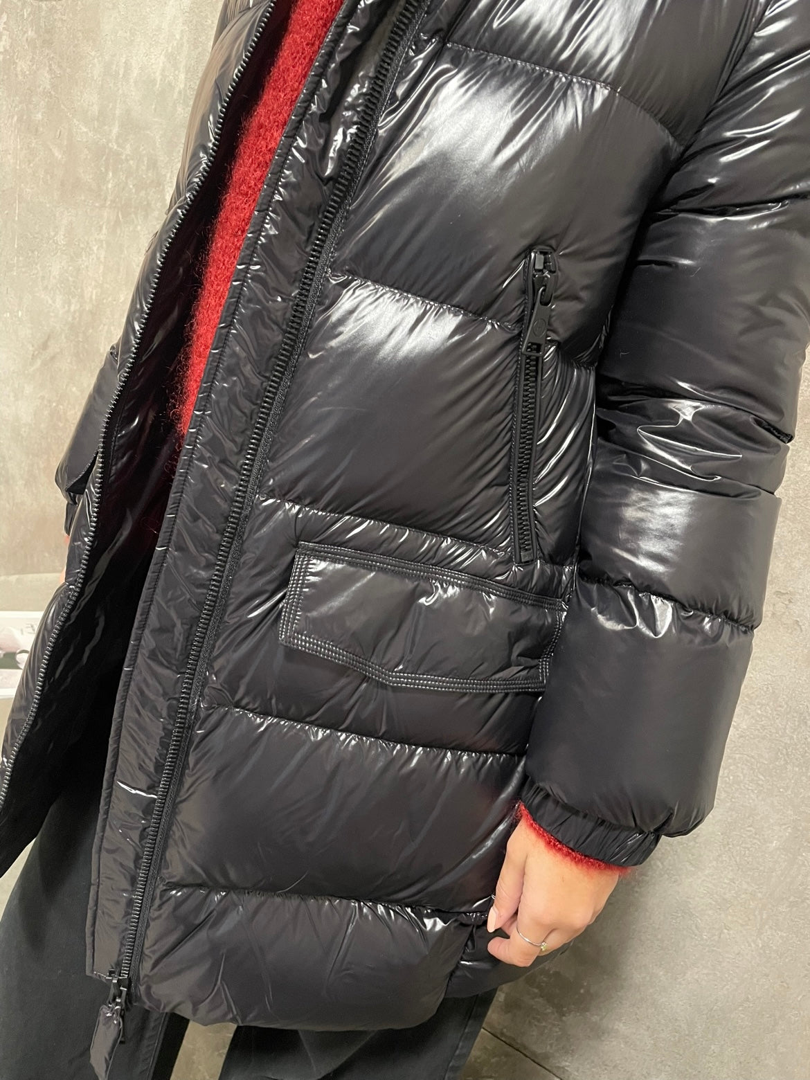 Piuminio maxi con cappuccio, tasche laterali e tasche a toppa, chiusura con zip.