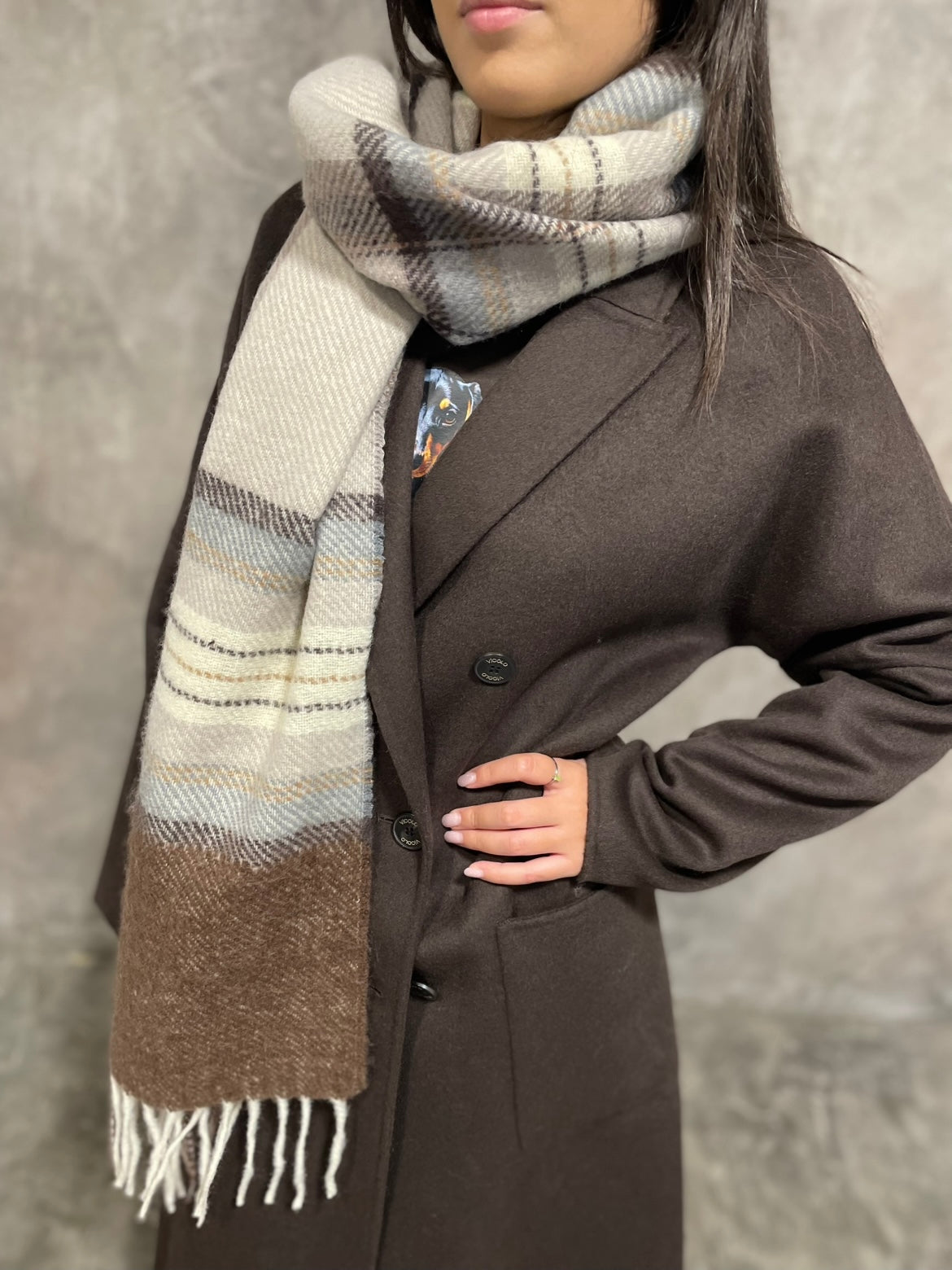Sciarpa fantasia a quadri sui toni del panna e marrone.