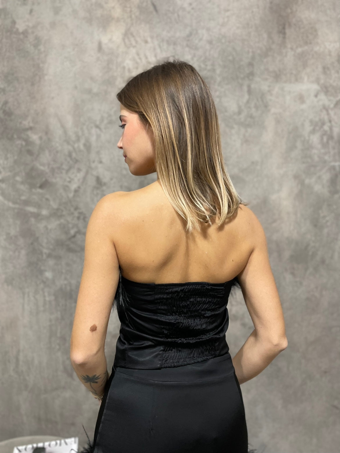 Top satinato in misto viscosa. Linea a fascia crop top. Pinces sul davanti e applicazione piume. Elasticizzato sul retro e fodera.